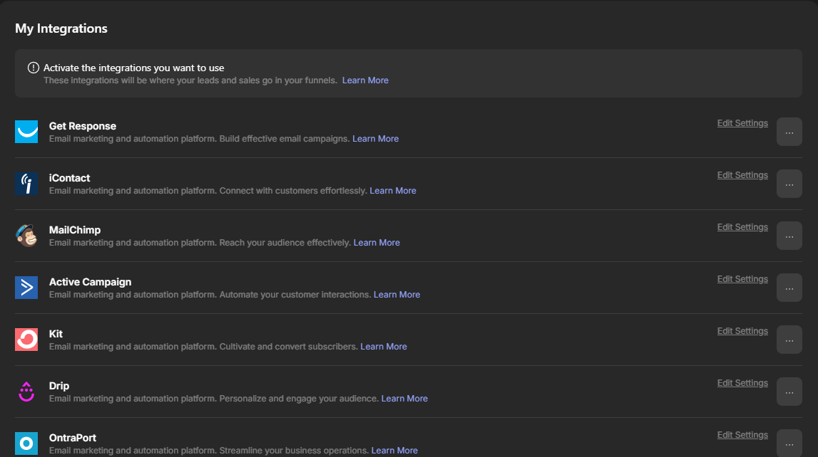 ⇨ Toggle on the CRM you want to integrate your account with then enter the API settings needed.