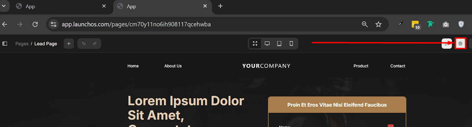⇨ Go to the duplicate tab to access the page you were working on earlier then click the [gear] icon to access page settings.